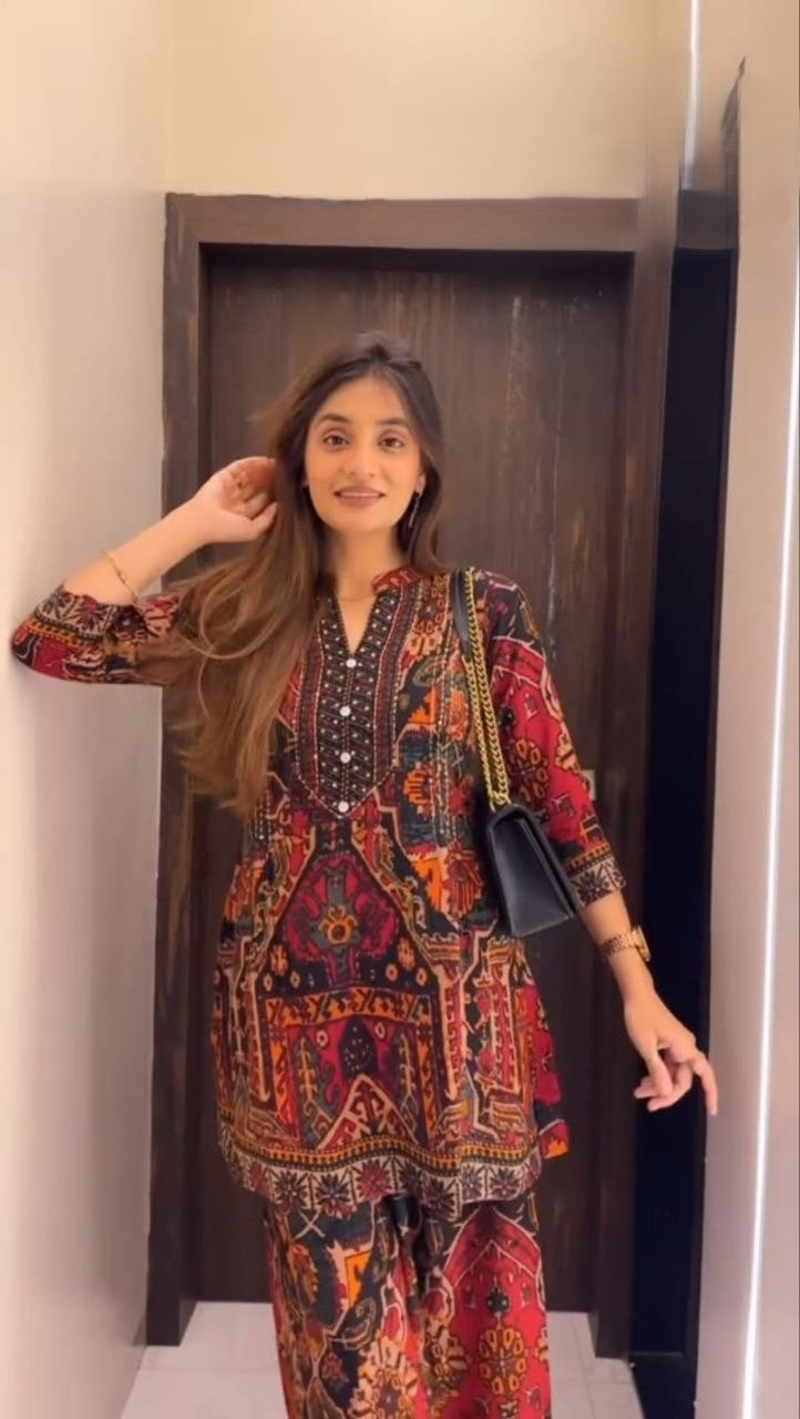The set features a stunning Banarasi Silk top with eye-catching woven patterns, perfectly paired with matching pants for a cohesive and elegant look. What makes this ensemble truly special is the added accessory a Creamy Pearl Single Line Moti Mala, included to complete your festive styling in one go. With its lustrous pearls and minimalist appeal, the mala adds a graceful finishing touch to your outfit.